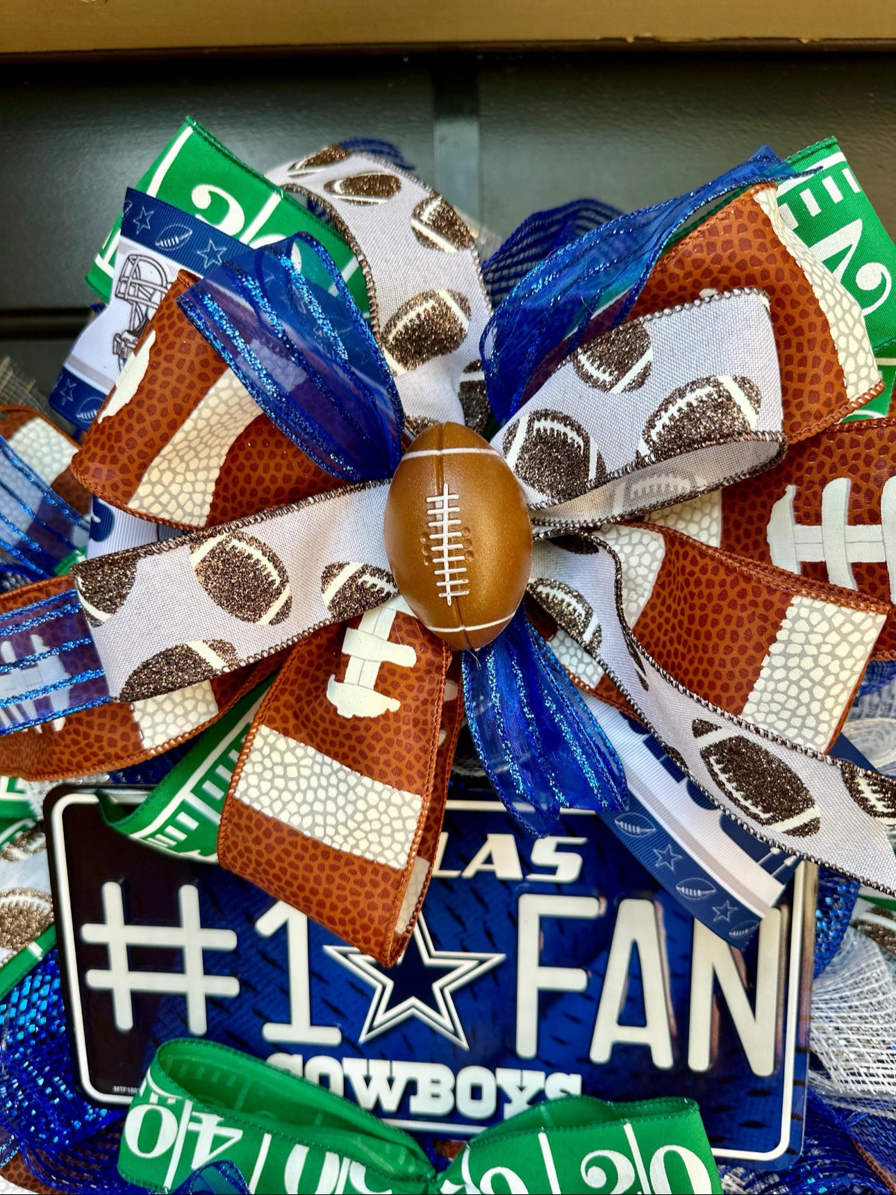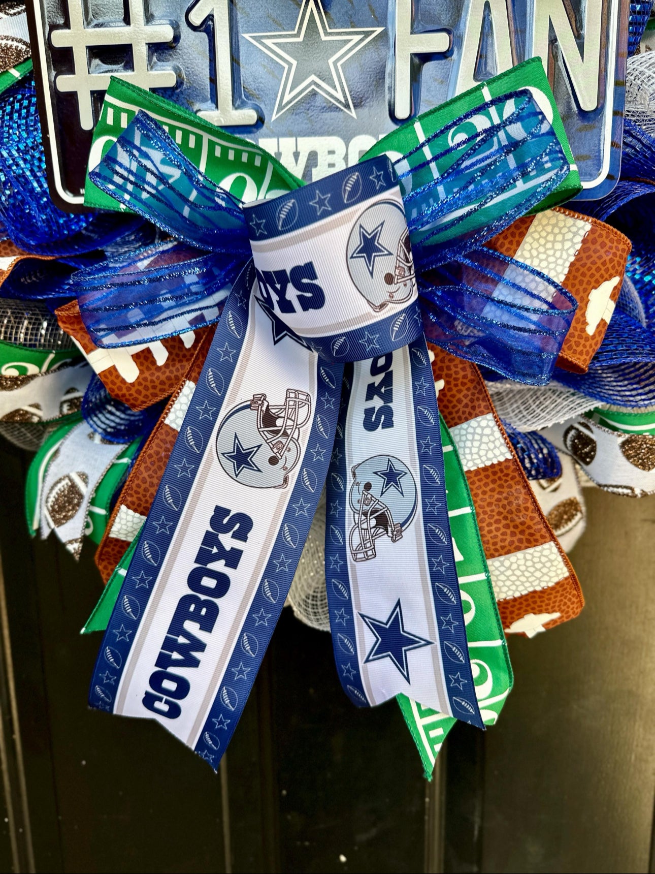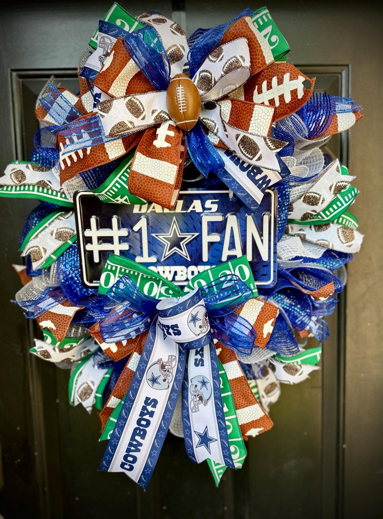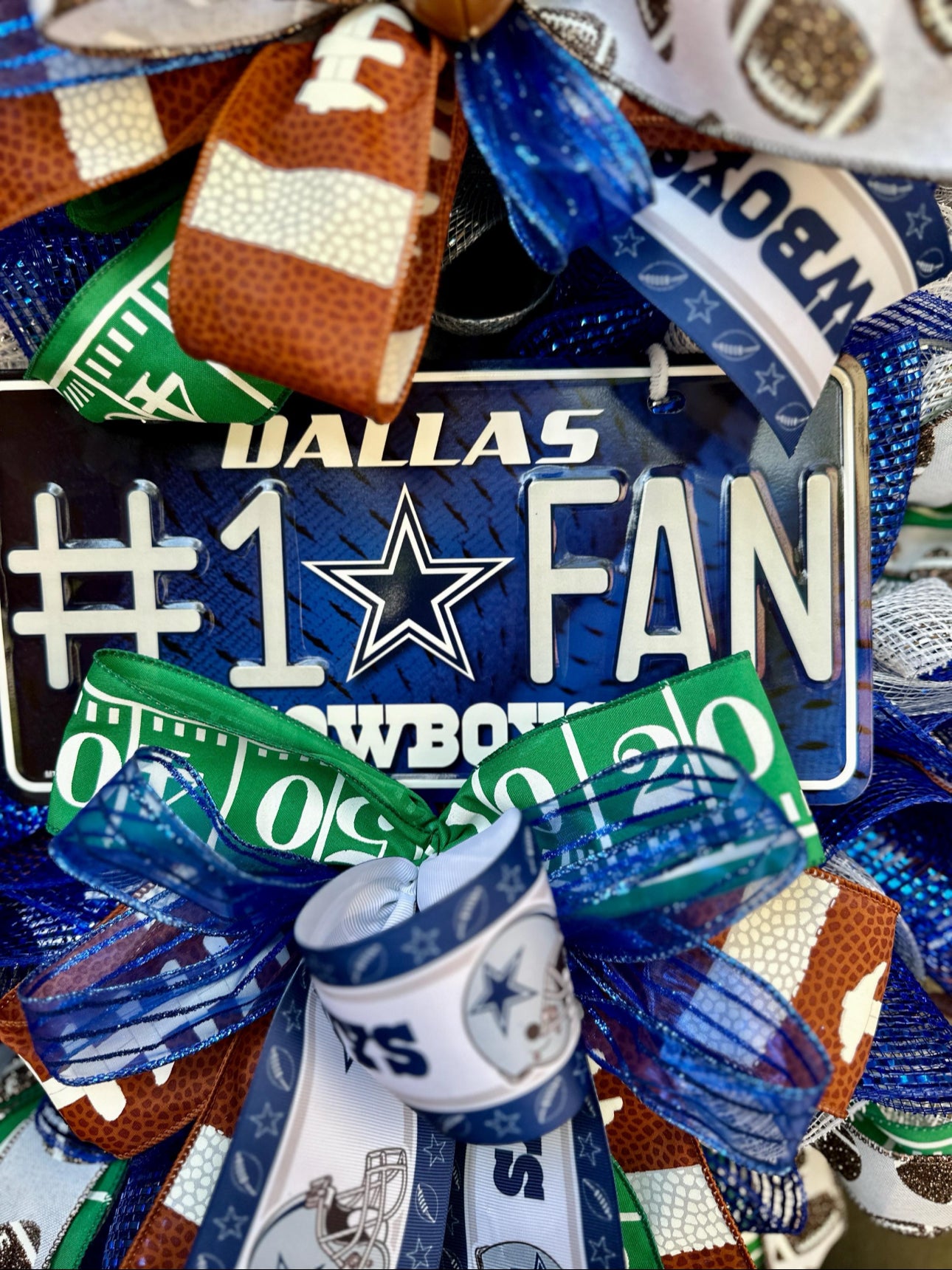 Introducing the Dallas Cowboys Wreath - the ultimate display of your unwavering support for America's Team! This exquisitely crafted wreath is a must-have for every die-hard Dallas Cowboys fan. Featuring a stunning Dallas Cowboys license plate at its center, this wreath proudly showcases your status as the number one fan. The centerpiece of this wreath is adorned with football ribbons, beautifully intertwined to create a dynamic and eye-catching design. The vibrant blue and silver color scheme perfectly captures the spirit of the Cowboys, while the meticulously tied bow adds a touch of elegance. Crafted with the utmost attention to detail, this wreath is the perfect addition to your personal space, be it your home, office, or man cave. Hang it on your front door to greet fellow fans with team spirit, or display it proudly on your wall to create a focal point that showcases your love for the Dallas Cowboys. Made with high-quality materials, this Dallas Cowboys wreath is built to last and withstand the test of time. It is carefully designed to capture the essence of your favorite team and bring the excitement of game day right into your personal space.
