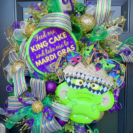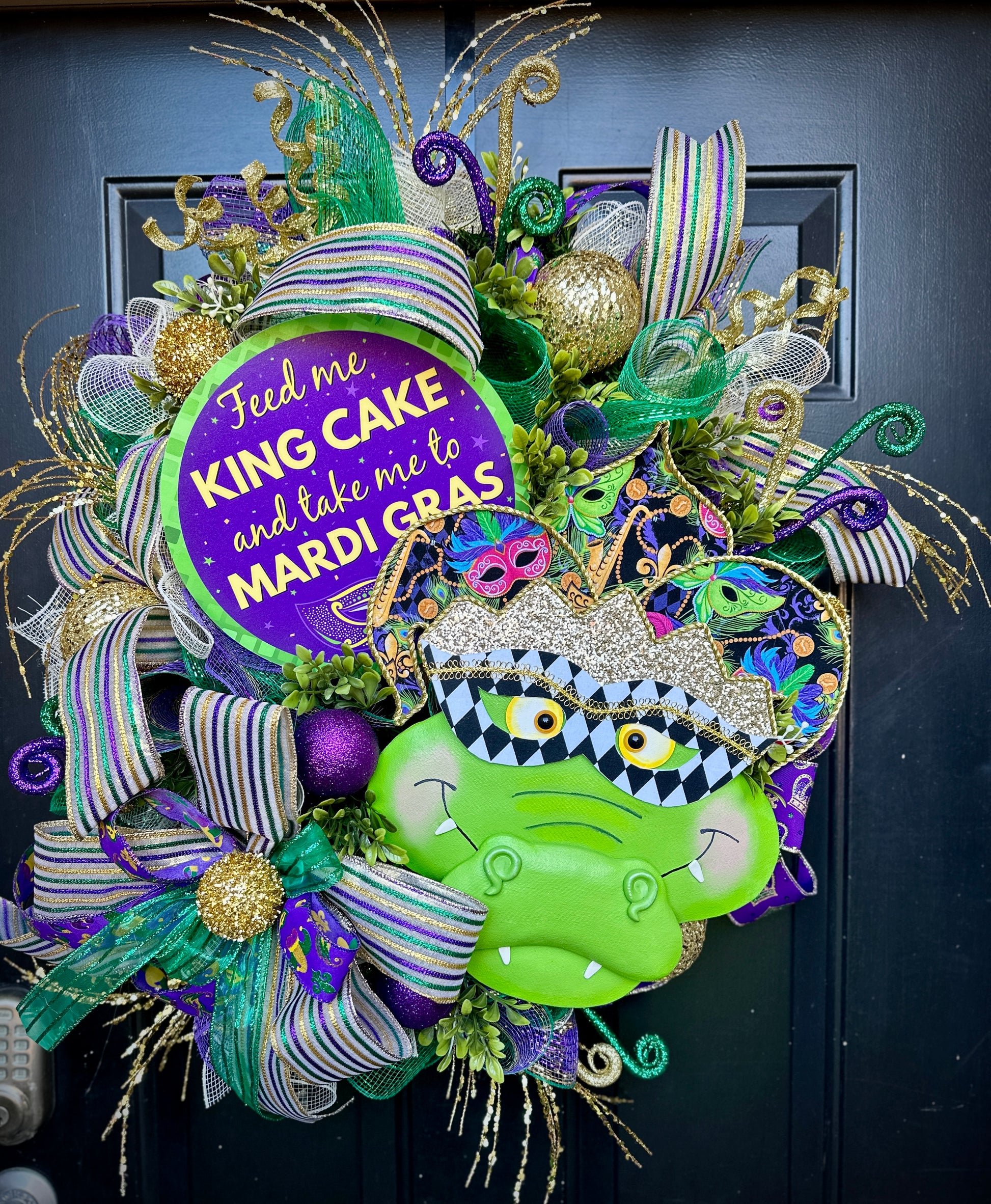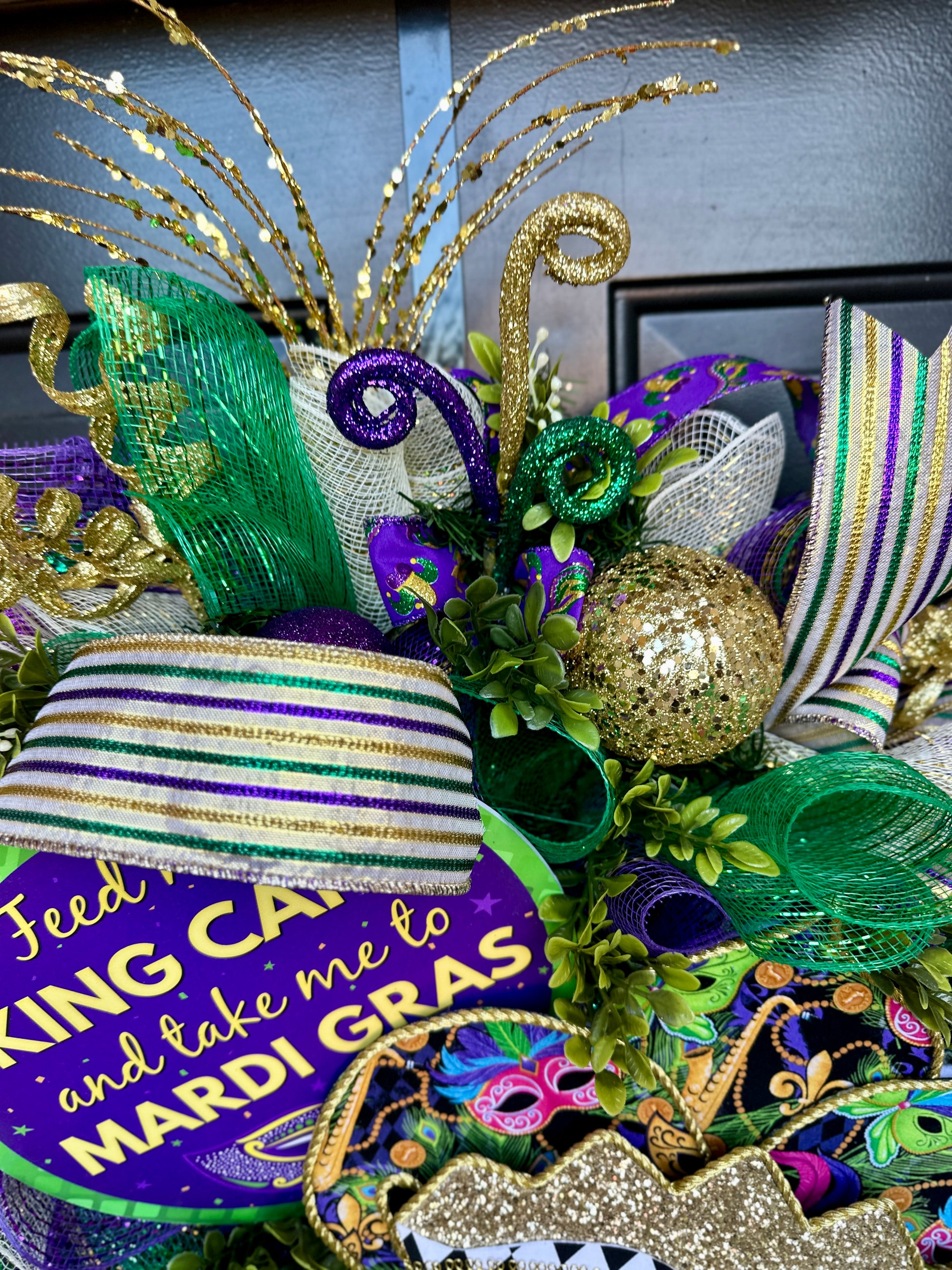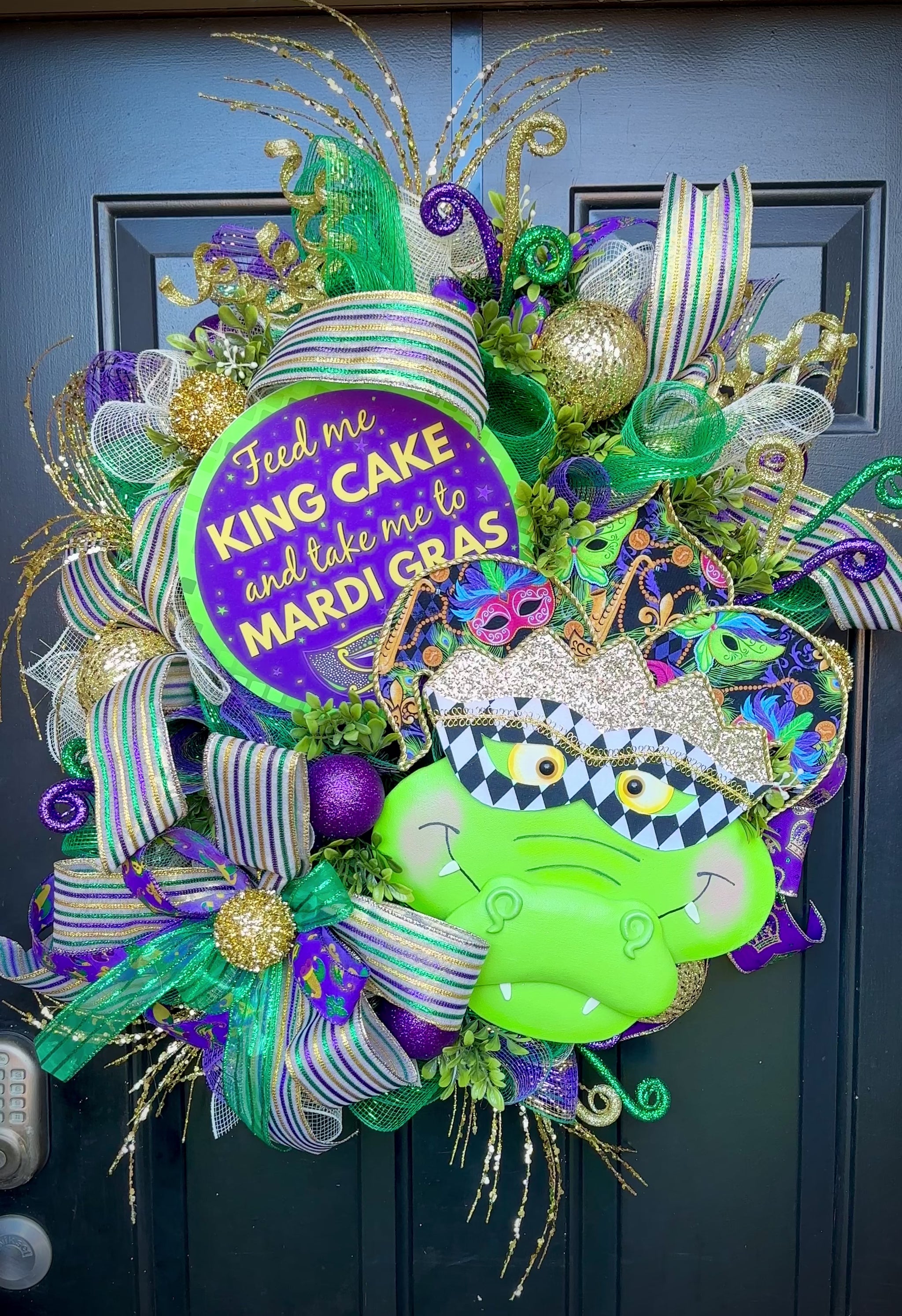 Introducing our exquisite Mardi Gras Wreath, the perfect addition to elevate your personal home decor. This captivating wreath boasts a vibrant display of Mardi Gras festivities, featuring a delightful king cake and an array of beautifully crafted decorations. Handcrafted with precision, this wreath exudes elegance and charm, making it a wonderful statement piece for your front door. Embrace the spirit of Mardi Gras and transform your home into a festive haven with our exceptional Mardi Gras Wreath.